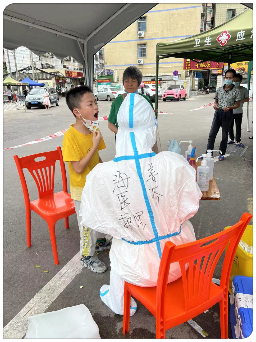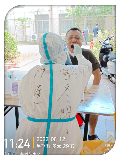 “这两天参加海医一附院核酸采集队伍,成为一名‘大白’我感觉很荣幸。今早根据安排到