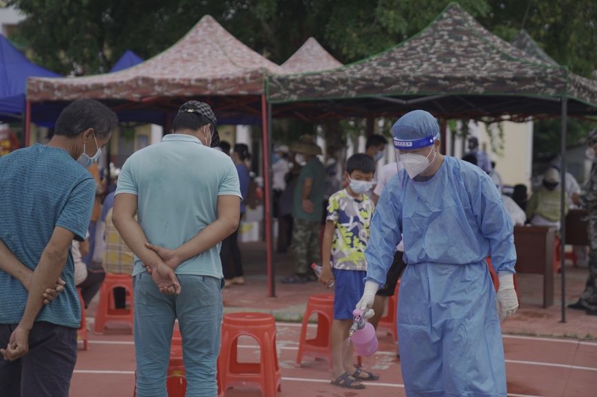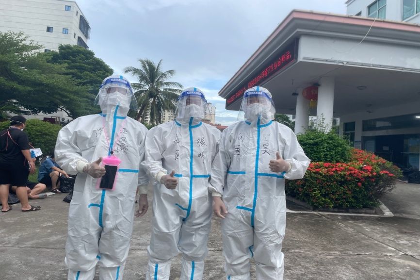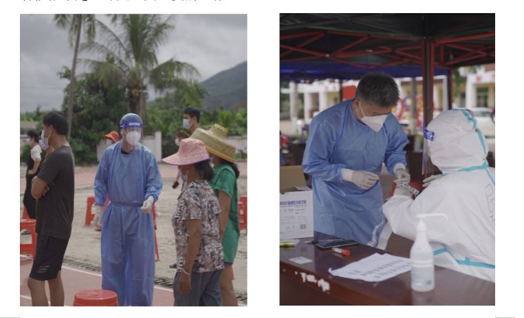 吴昊老师被分派到陵水提蒙乡,穿戴好防护服成为“大白”的他迅速进入战“疫”角色,挨家挨户进行防疫宣传,劝导村民非必要不外出,协助完成核酸检测……在盛夏的海南,穿着厚实的防护服奔走在乡间,投入到防疫工作中,他却早已忘记了已经湿透了的衣衫。