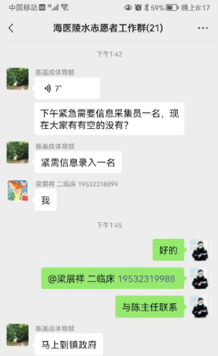 2022年8月13日13时42分,正在陵水英州抗疫指挥部工作的陈基成老师,突然收到紧急求助,英州隔离区需要2名志愿者前往参与信息录入工作。陈基成立即交接好手中的工作,准备前往隔离区参与信息录入工作。同时在海医陵水志愿者工作群中发出通知,还需要一名志愿者一同前往。消息发出去后,刚刚结束上午工作回到驻地的第二临床学院辅导员梁展祥老师马上回应参加。并马上赶往镇政府,立即出发。