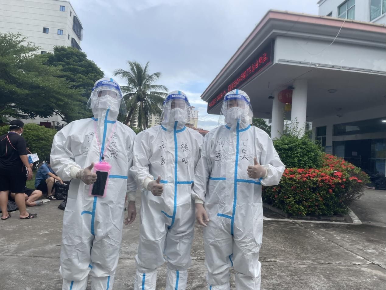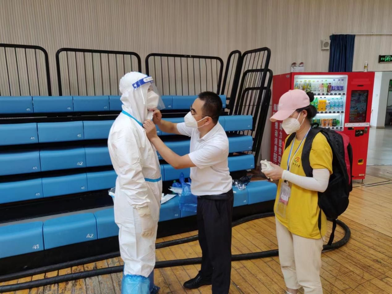 服务队队长张秀峰作为临床专家,与英州镇政府一起规范核酸采集工作流程,并前往陵水雅乐居体育馆方舱实验室,对15名志愿者进行防疫防护知识培训,并对志愿者如何正确穿脱防护服、做好自身防护进行一对一的指导。看到这些年轻人因第一次承担志愿者工作而有些忐忑,张主任鼓励他们说:“你们在穿脱防护服的时候,我都会在旁边看着你们操作,有问题我会及时指导,所以不要有任何担心。”他耐心细致地讲解,提升了志愿者的防护意识和能力,极大地增强了志愿者们从事抗疫工作的信心,为抗疫工作起到了重要作用。