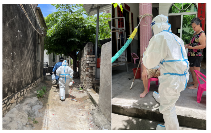 虽然整个村子才有一千三百多户村民,但由于村民居住地零散偏僻,村里老人小孩居多且没有智能手机,录入程序缓慢,以至于挨家挨户上门做完一轮核酸,需要花费一天的时间。第一天上岗时,由于天气太热加上长时间的户外采集,厚厚的防护服和口罩压得我喘不过气,曾一度呼吸不上来,中途紧急暂停了十分钟,那一刻我眼中都是泪花,深感一线医护人员的不容易,也默默为自己打气,最后坚持了下来。