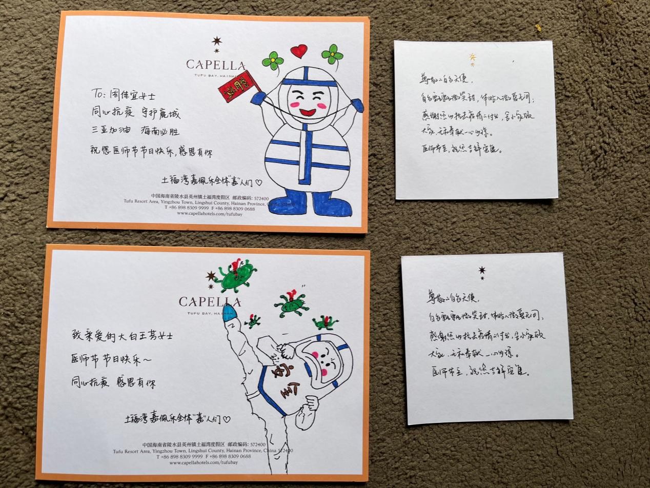 在海南嘉佩乐酒店,员工们为表达这段时间以来医护人员和志愿者的“每日相见”和辛苦付出,特意准备了环保布袋和节日祝福卡片。