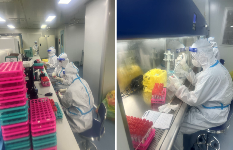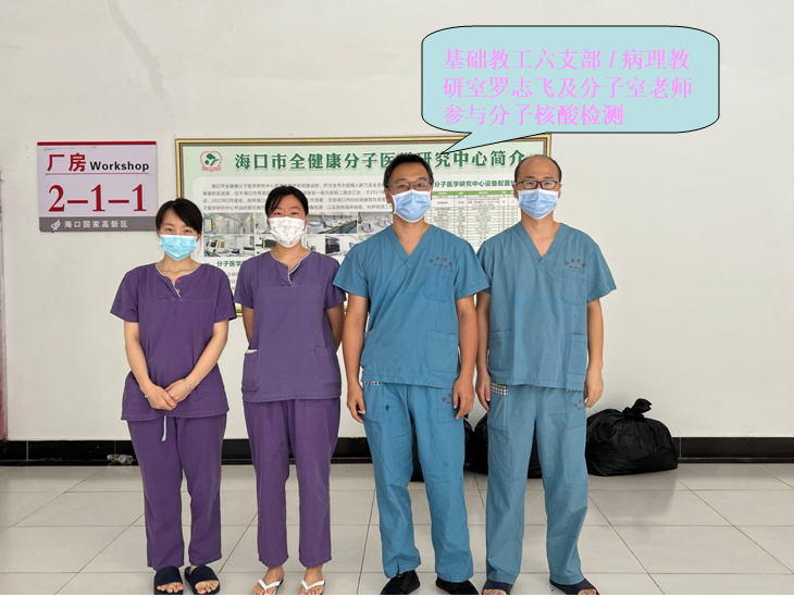 基础医学与生命科学学院教工第六党支部积极响应党委号召,充分发挥医学院校专业优势,发挥本教研室教师双师型人才优势,带领全体党员干部勇挑重担、冲锋在前。在支部书记的号召下,教研室主任的支持下,支部党员罗志飞的带领下,参与了全省的核酸样本分子检测。支部党员罗志飞老师于8月2日接到疫情通报后,立刻带领分子病理室的四位同志,赶赴卫健委备用的核酸实验室—全健康分子医学研究中心,对全省的核酸样本进行分子检测。尤其在三亚疫情爆发后,四位同志连续多日加班加点,日夜坚守在核酸分子检测的第一线,及时准确地发出核酸分子检测的报告,为全面打赢此次疫情防控阻击战贡献了自身力量。