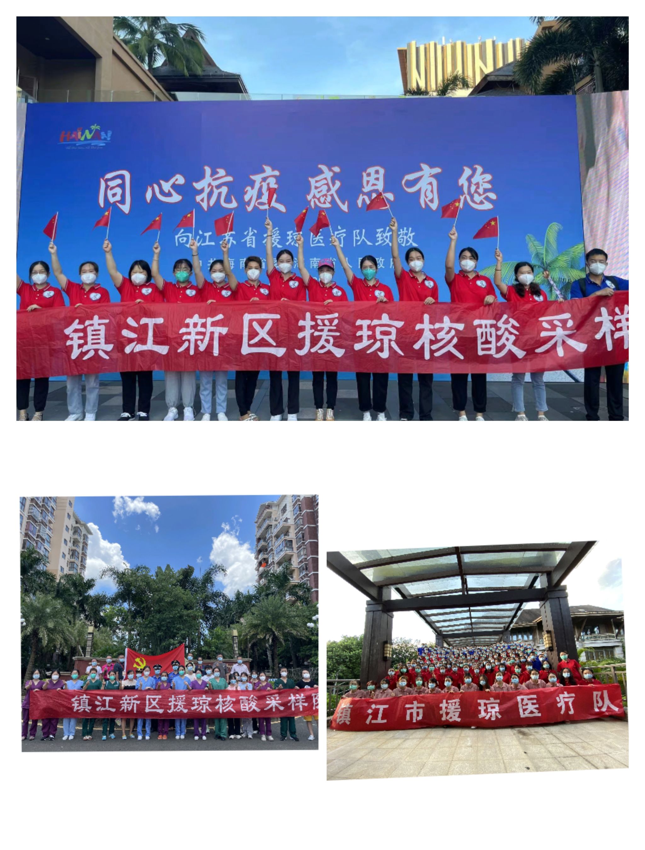 海南本轮疫情出现以来,全国20余省、市,共派出20000多名医护人员前往疫区支援,其中镇江在8月11号接到江苏省卫健委的通知后,次日各医疗机构火速集结252名医护人员,从南京禄口国际机场飞往海南海口,13号开始为定安县进行核酸筛查,历时4天,完成任务,17号在三亚疫情最严重时期镇江队200多人转战支援,在疫情逐步向好时,29号镇江队圆满完成任务,有序撤离。
