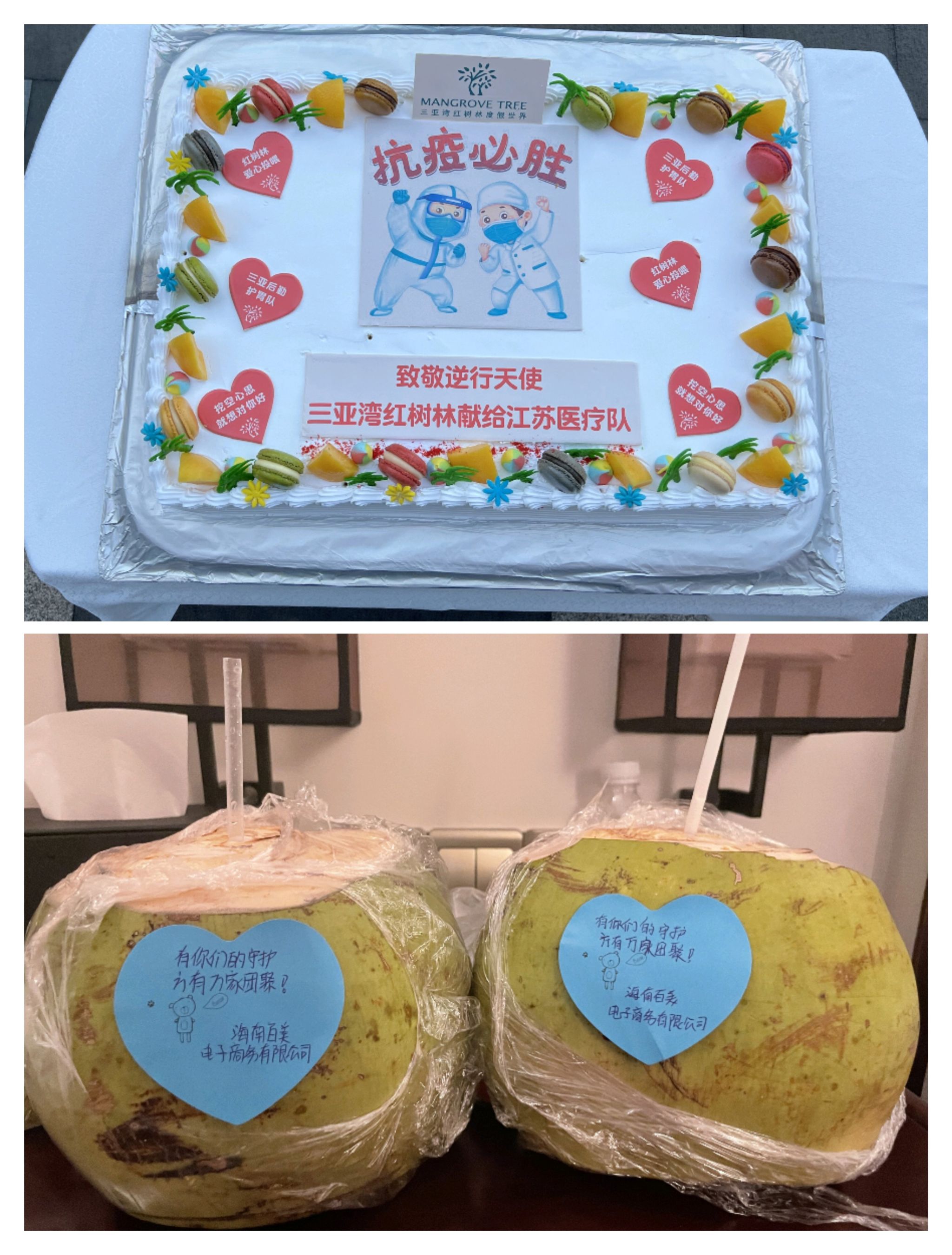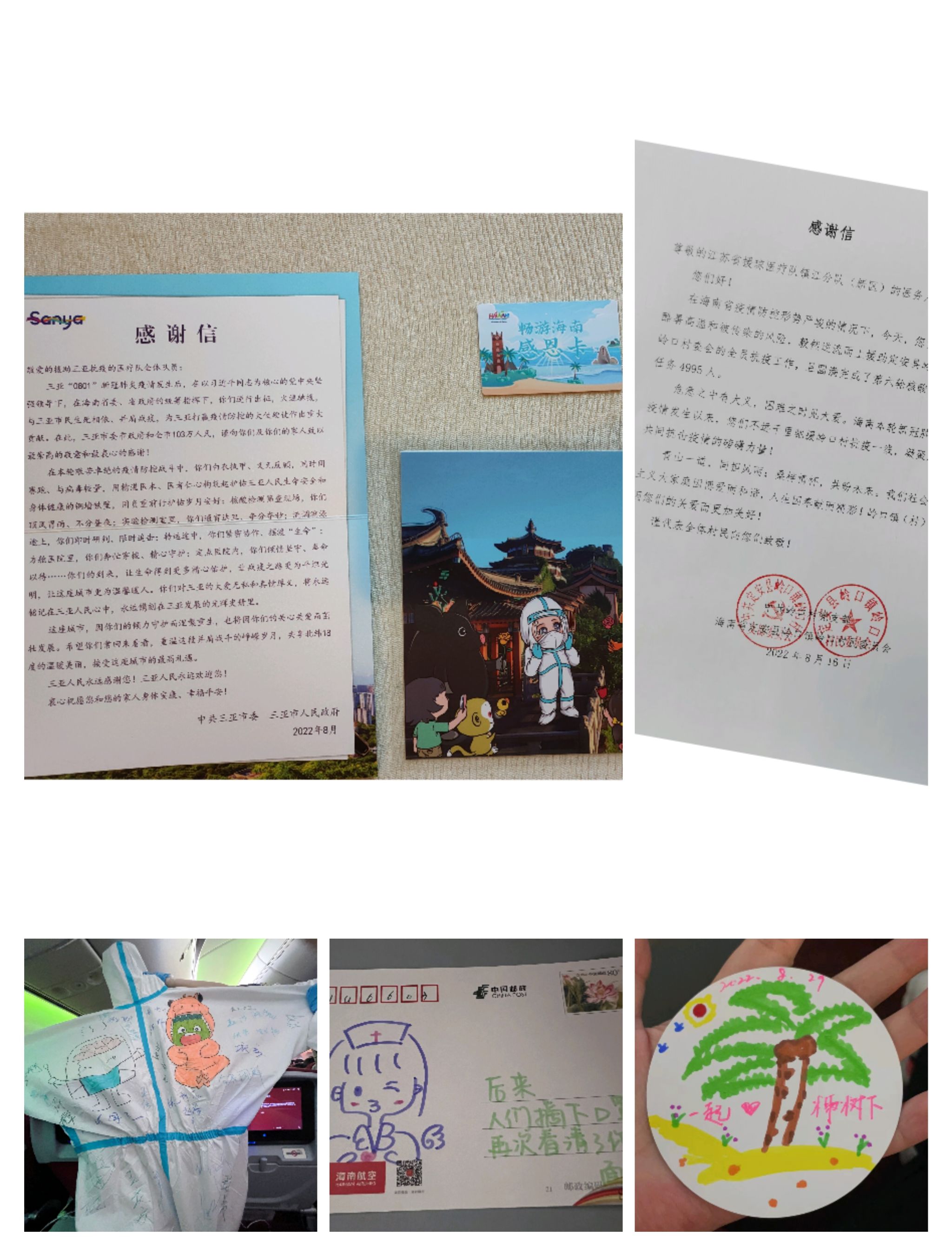 在定安县为当地核酸筛查时充分感受到当地人民的热情,椰汁、肉粽、菠萝蜜、椰肉糍耙、辣椒酱,他们恨不得把所有海南特产给我们尝个遍,离开定安时还收到县政府的感谢信。在三亚撤离前夜,我们欣赏到三亚市政府组织的无人机秀,三百架无人机闪亮三亚夜空,收到他们颁发的荣誉证书、送的“感恩卡”、感谢信,离开当天交警开道、旗帜欢送,在海口美兰机场收到免税店送的化妆品套装,在海南航空飞机上,收到航空公司送的礼物、明信片,空姐还为我们准备了手势舞表演,满满感恩情,由心而发,让我们“满载而归”。