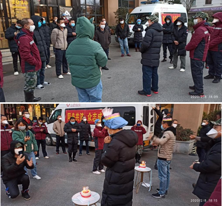 为了避免交叉感染,傍晚的全队会议在酒店门外举行,人与人之间间隔1米开外,大嗓门的陈潇男队长爬上通讯指挥车给大家传达会议内容,还给大家带来了一个意外消息:今天还是周晓华、陈静两位队长的生日!大家围成大圈唱生日歌,袖珍蛋糕蜡烛也必不可少,仪式简单而欢快,这应该是两位寿星最难忘的生日聚会了吧。