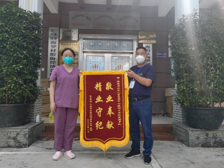 “感谢你们在关键的时候伸出援手,用实际行动支持三亚吉阳区海罗村开展全员核酸检测工作,向你们致敬!”8月12日,三亚市生态环境局吉阳分局曹志明局长向海南省妇女儿童医学中心援助三亚核酸采样队赠送了印有“精业守纪 敬业奉献”金字的锦旗,对中心医护团队驰援海罗村全员核酸采样工作,助力三亚吉阳区做好疫情防控表达诚挚的感谢。