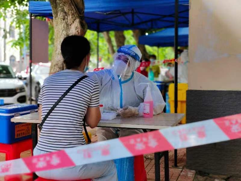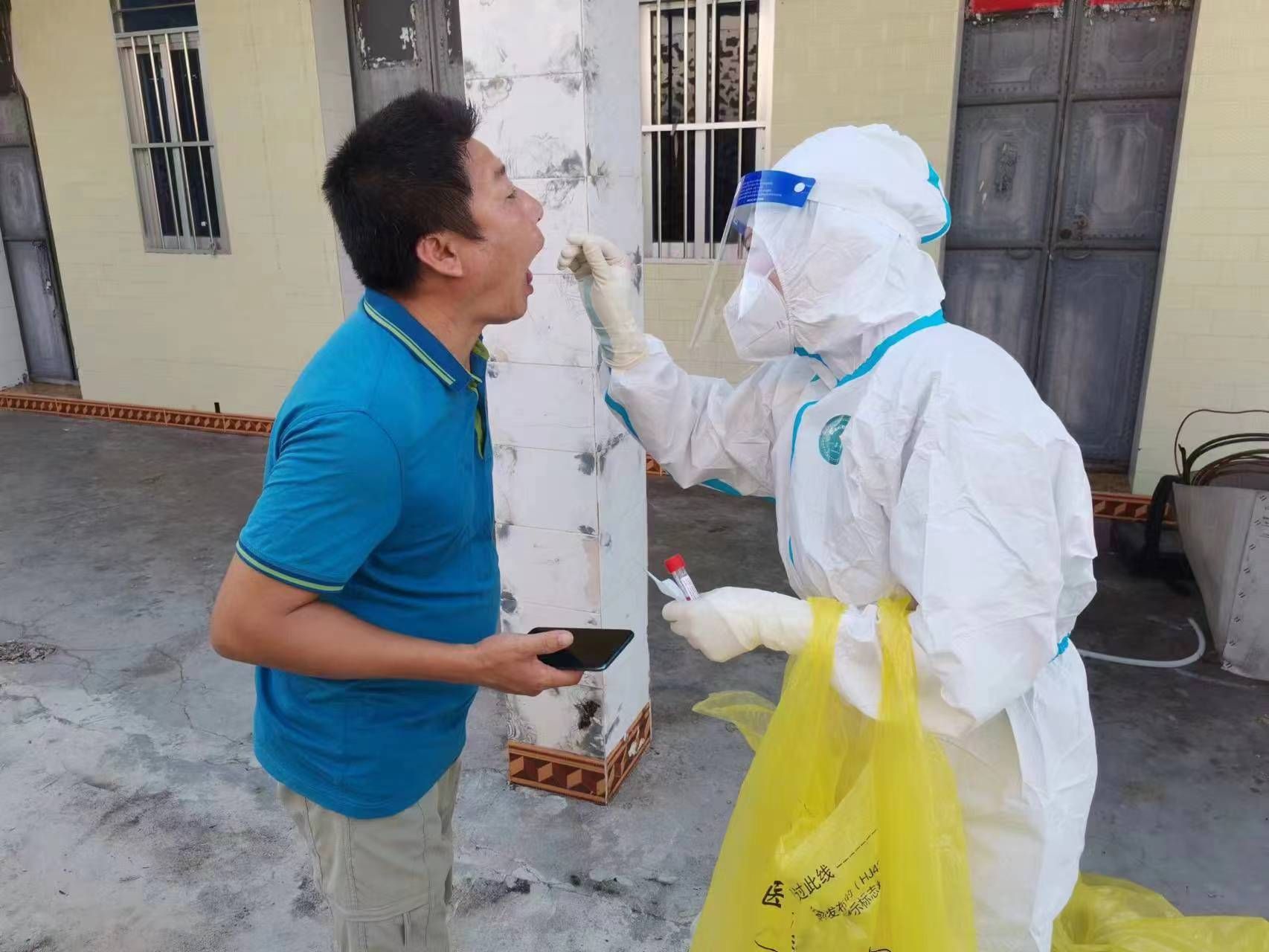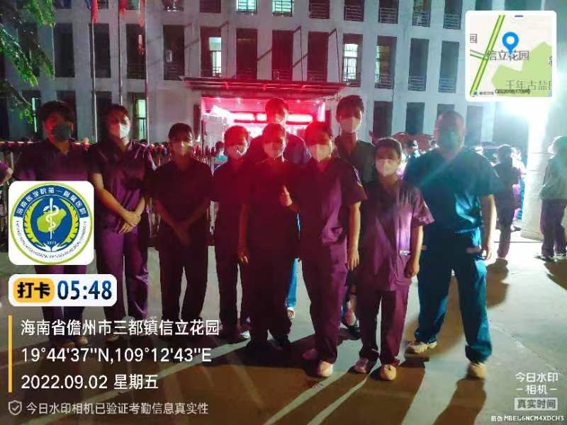 9月1日,4点30分起床,5点20集合出发到社区等待负责人接我们去点位。看着这座小城的夜色,让我想起了2017年硕士毕业那年去敦煌,我对敦煌莫高窟112窟的反弹琵琶十分着迷,走的那天早上恋恋不舍,夜色下的敦煌尤为神秘,那一年没有疫情,不需要戴口罩,也没想过自己会把海南作为第二故乡,更没想到会来儋州支援。儋州的夜色和敦煌有着不一样的美,晨光熹微,夜色温柔,想想九百年前大文豪苏东坡也在此生活过,便觉得更加亲切。很快,大家都被负责人带到不同点位,开始采集工作,我们纷纷进入高中风险地区,因为人员短缺,所以每人采集量是原来的几倍之多,连续三四个小时,刚穿上防护服,汗水便慢慢沁出,好像32℃闷热的天气要把我们身体的水分榨干,但是上台之前不敢喝太多水,怕中途需要去厕所。点位条件有限,没有风扇,没有冰块,有的在马路边,有的在田间,有的在小区楼下,有的在大庙门口,有的有一张桌子,有的只有一把椅子,有的村物资紧张,如果不是原则上问题,我都尽量将就,本来戴7号半的手套,但是去了一个村,只有7号,我看着烈日下排着长队的群众,拒绝了负责人要去10公里之外的办事处取手套的建议,戴小一号手套虽不影响采集速度和质量,但是2个小时后右手食指开始麻,我不断的攥拳,缓解麻木,集中采集后需要上门采集,于是我们走街串巷,入户采集,烈日炎炎下,每走一步路,我都给自己打气,加油!还有5家、4家、3家、2家、1家...上门采集的人主要是卧床不起的老人或者居家隔离的人员,采到一户人家,是一位耄耋老人,卷曲着躺在硬板床上,看到我进来去便要起来,因为我走路有点缺氧,便是示意她不用起来,她点头后,努力的长大嘴巴,配合采集,采完后瞬间虚弱下去,但是依然双手合十轻声说了句谢谢,我心里有点难过,说了句“也谢谢您老人家的配合”。走出来后,虽然衣服都已经湿透,虽然有点缺氧,但是看到老人家这样配合国家抗疫,我想这就是我坚持的意义,这就是中国力量!