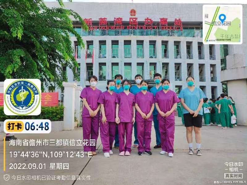 8月31号,是我在海口采核酸任务的第27天,那天担任小组长,接到儋州的任务时,是中午12点,我在海口市第25小学点位采核酸中途下来休息,看到消息,便给正在三亚做志愿者的老公发了个微信说我想去儋州支援,微信对话框一直显示“对方正在输入”,过了5分钟左右,我收到:“去吧!做好防护”,就这样我俩都成了海南疫情抗疫中的一员,一个在三亚,一个在儋州。但是这件事只有我们两个人知道,因为公公婆婆和2岁多的女儿还在长春,因为婆婆每天都能通过短视频平台了解海南疫情有多严重有多少医疗队支援,因为她睡眠不好白天还得哄孩子,所以我俩选择保密,谎称单位要求闭环住酒店工作。并且以海口疫情为借口无限期拖延了他们来海口的时间,婆婆因为陈旧性骨折一直后背疼,我们担心他坚持不了,所以网上买了十盒她经常吃的药。我俩心里清楚面对疫情家里的每个人都在咬牙坚持,同事也在坚持,那我们有什么不能坚持的呢,困难都是暂时的! 因为在海口市第25小学担任队长,晚上还要出发去儋州,得提前回家准备东西,于是向护理部报备,护理部虽然说正在协调人员前去支援,但是我知道已经没有人了,于是申请组内自行解决不需要支援,为了剩下的3组员能够胜任下午的工作,我决定把工作量抢一抢,就这样我吃口饭,汗还没消,12点半又上去采核酸到15点,下来安排剩下的工作后,匆匆回家收拾东西,整个下午内心很平静,并没有老公去三亚那天那么紧张,很安心去的人是我,我想在自己最好的年纪为这个国家做点事!