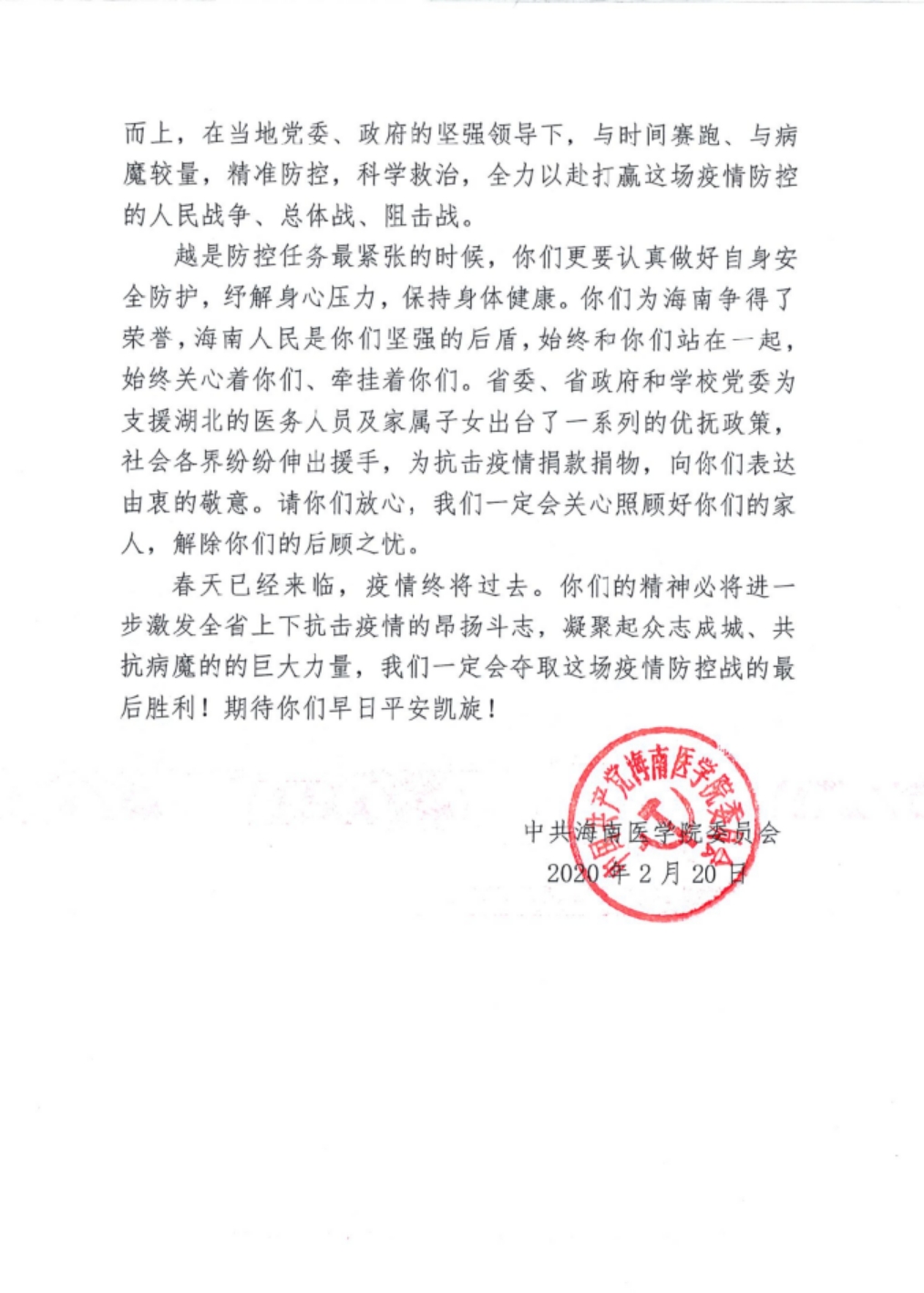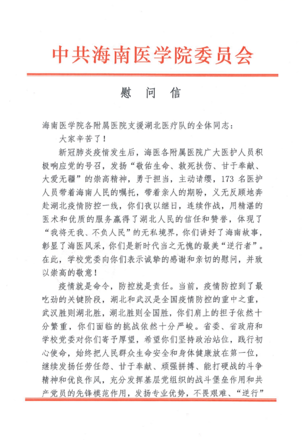 党委致支援湖北医疗队的慰问信