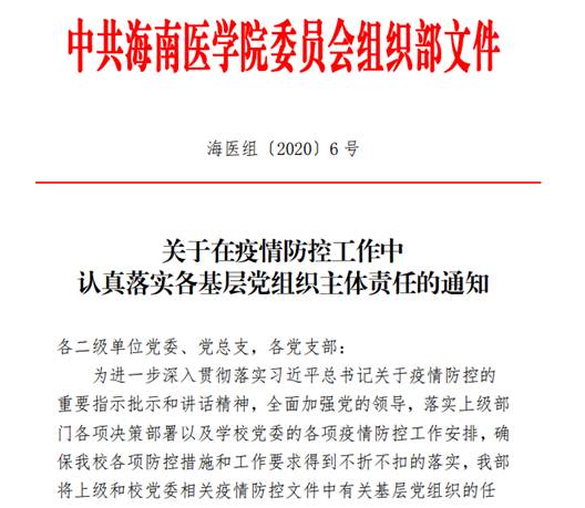 “让党旗在校园防疫阵地立起来,将红色战斗堡垒建在防疫战斗的第一线。”自疫情发生以后,我校党委组织部根据省委《关于迅速动员各级党组织和党员干部坚决打赢疫情防控阻击战的通知》的要求,迅速反应,拟定并提请校党委印发了《中共 委员会关于加强动员基层党组织和党员干部坚决做好疫情防控工作的通知》,竖起了战斗旗帜,指引全校师生党员全身心投入到这场没有硝烟的战斗中。为全校各级党组织充分发挥战斗堡垒作用和党员干部发挥先锋模范作用提出了总的要求和基本遵循。