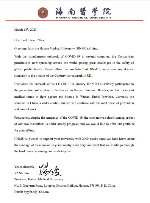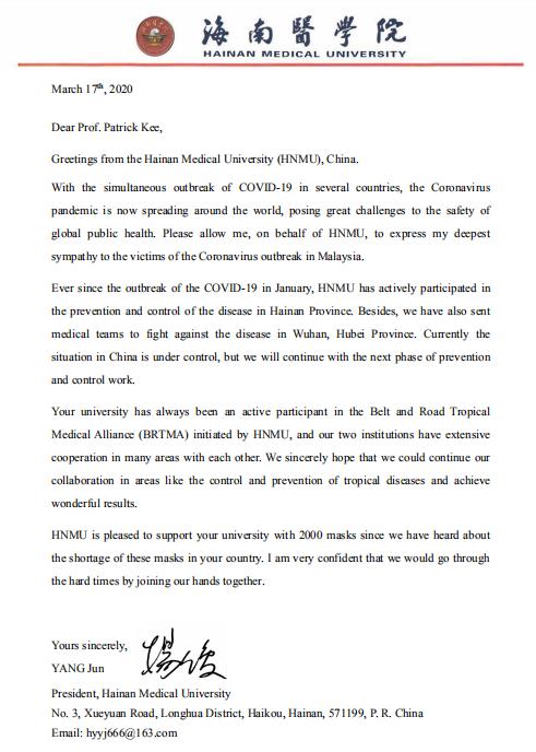 向与我校紧密合作的美国内布拉斯加大学Jeffrey P Gold校长、英国西英格兰大学Steven West校长、柬埔寨卫生科技大学Saphonn Vonthanak校长、马来西亚世纪大学Patrick Kee校长发出了真挚的慰问信,向他们予以诚挚慰问,表示我校将与他们一起共同抗疫,同时向四所学校各捐赠口罩2000个。
