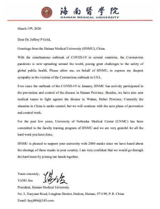 美国内布拉斯加大学校长杰弗里·P·戈德医生回信表示,非常感谢我校慷慨的支持和提议,并将邮件转发给奥马哈的一个美国国家级传染病防控中心。