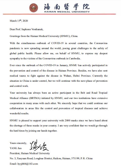 柬埔寨卫生科技大学Saphonn Vonthanak校长回信表示,感谢我校发来的慰问信以及捐赠,这笔捐助对他们的大学来说是非常及时和宝贵的,对柬埔寨人民来说也是非常有意义的。 患难见真情!近期柬埔寨的新病例数量急剧增加,要与这种全球大流行病作斗争,仍有很多工作要做。 但是他们坚信,通过我们共同努力一定能战胜病毒的。
