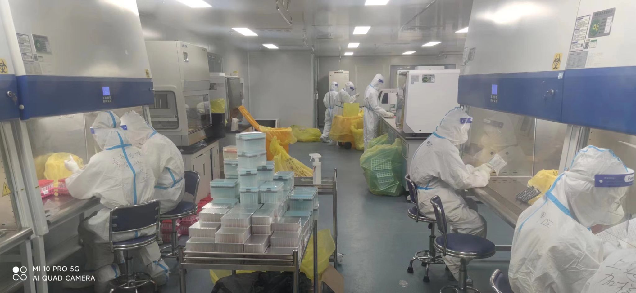 为了在最快的时间内能够出具检测报告,检验人员们在实验室里一坐就是六七个小时,常常是只有吃饭的时间出来透口气,又接着去工作。工作期间要穿着全套防护服,佩戴N95口罩、护目镜与防飞沫面屏。接收标本、分拆包装、编号、摆管、信息核对、准确录入、合理分组、试剂分杯、开盖加样、摆板提取、上机扩增……一道道流程有条不紊,规范有序。这既是一项技术活,也是一项体力活,一个班下来,大拇指磨得通红,长时间重复同样的操作,双臂僵硬酸痛。再加上术后的不适,张天蔚防护服里的衣服早已被汗水浸湿。“第一次去实验室,弄到凌晨三点多出来,但是工作时高度紧张,好像也不觉得疼了。”张天蔚回想起支援核酸检测的第一天,却表述得云淡风轻。