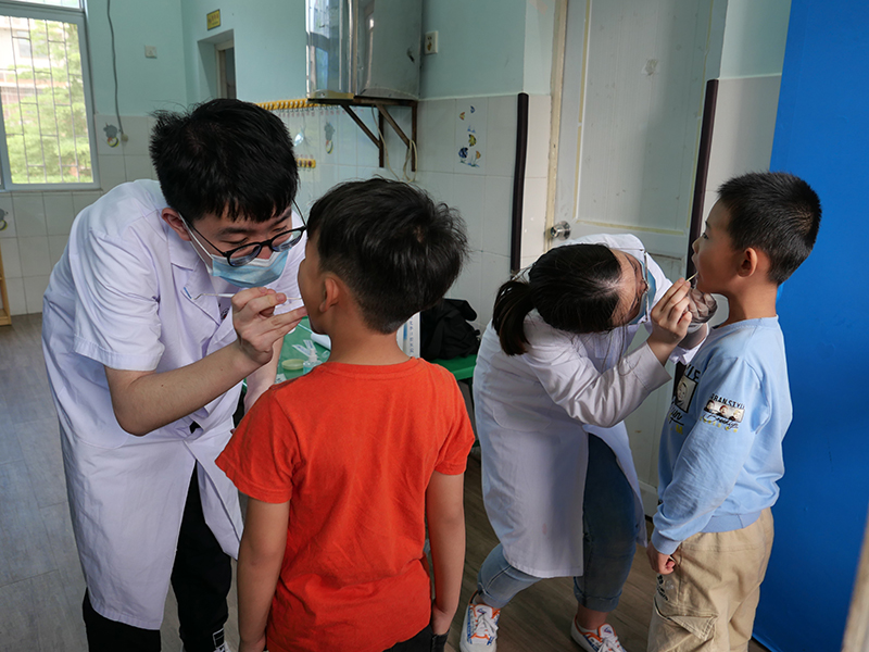 宣讲结束后,负责口腔检查的志愿者们为在场的每一位小朋友都细致地检查了牙齿,并将他们的牙齿情况逐一记录。