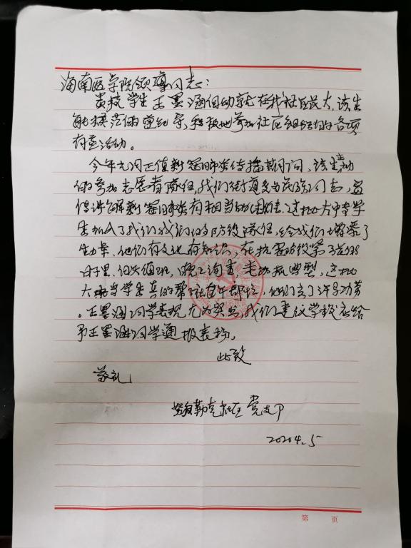 近日,我院收到一封来自新疆伊宁市琼科瑞克街道努尔勒克社区党支部的表扬信,信中赞扬了我院2016级口腔医学本科班王墨涵同学在抗疫期间,作为一名志愿者为防疫工作做出的努力和辛劳付出。