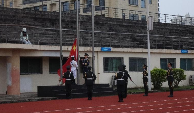 升旗仪式开始,国旗护卫队迈着整齐的步伐,护送国旗走向升旗台。在雄壮的国歌声中,鲜艳的五星红旗冉冉升起,迎风飘扬。现场师生共唱国歌,向五星红旗行注目礼。