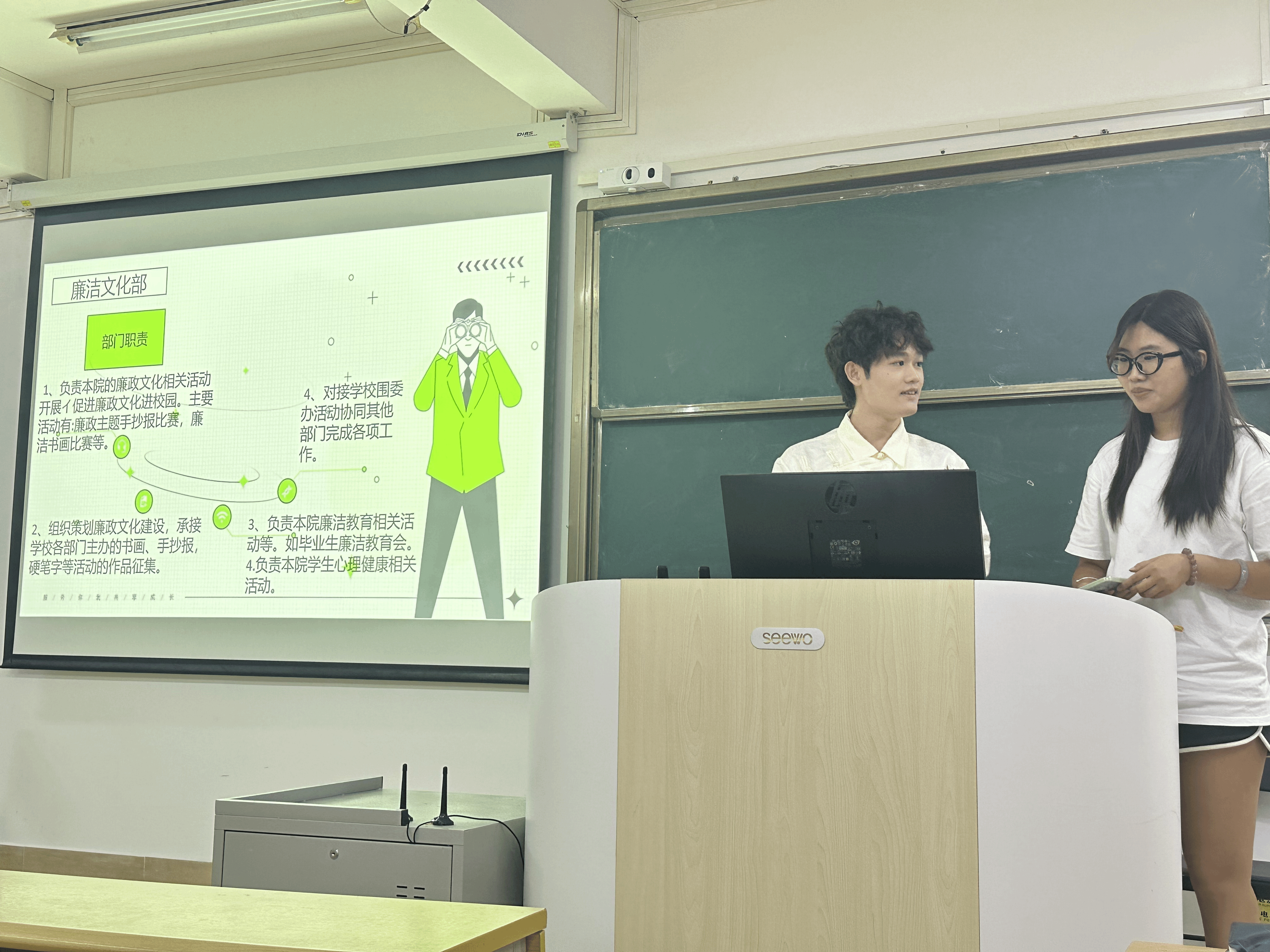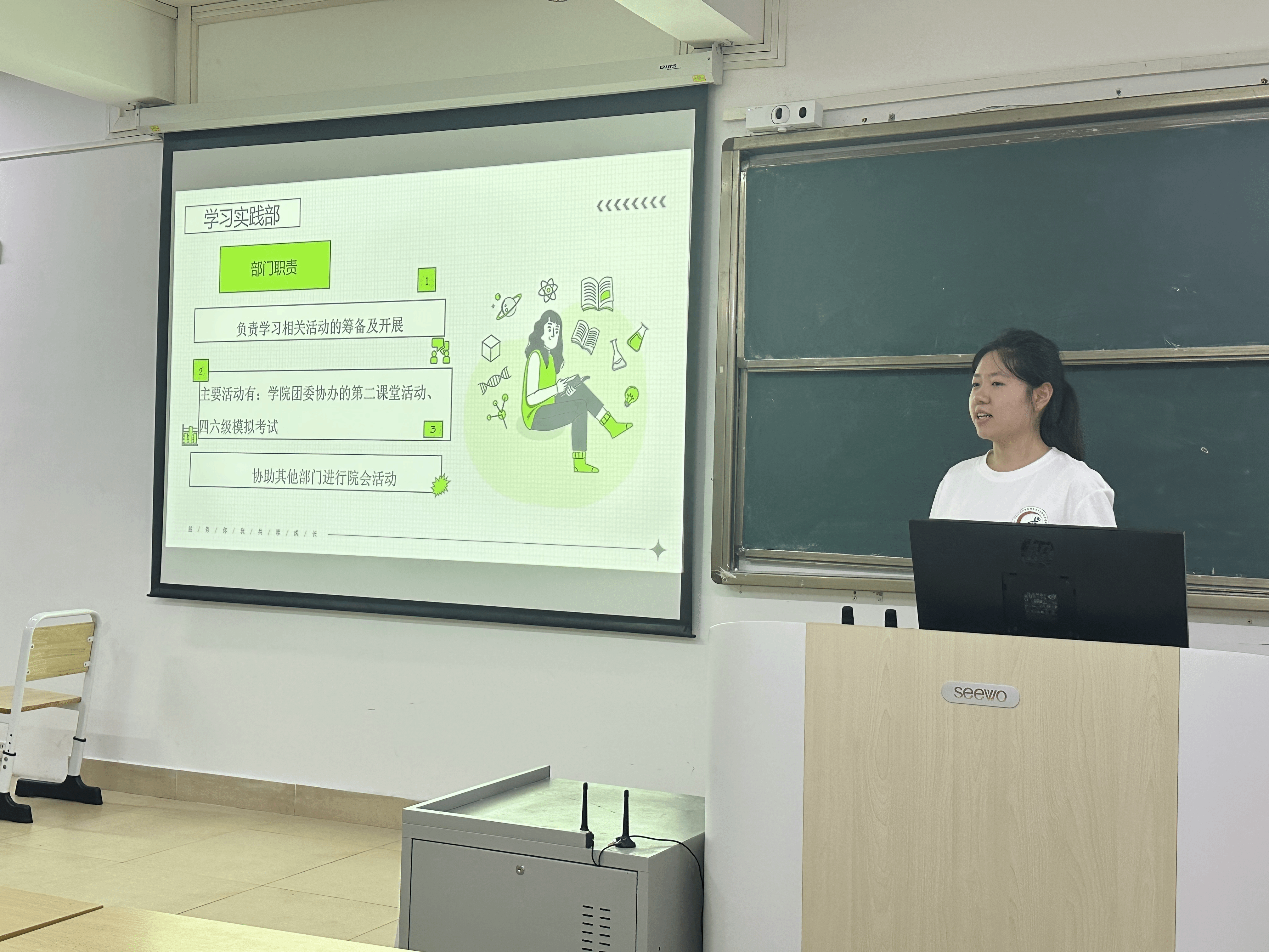 在宣讲环节中,主席团成员及各部门副部长以学长学姐的身份,向新生详细介绍了各部门的职能与品牌活动。学院团委书记任瑞老师在各部门宣讲后,对各部门工作作了补充介绍,帮助新生更好地做出选择: