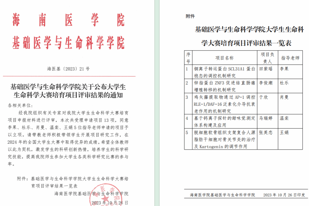 经我院组织有关专家对大学生生命科学大赛培育项目申报材料进行评审,本次共受理申请项目13项,同意李果、杜乐、肖曼、温栾、王娟5位指导老师申请的项目予以立项。希望带教老师积极带领学生开展项目研究工作,在2024年的全国大学生大赛中取得优异的成绩。