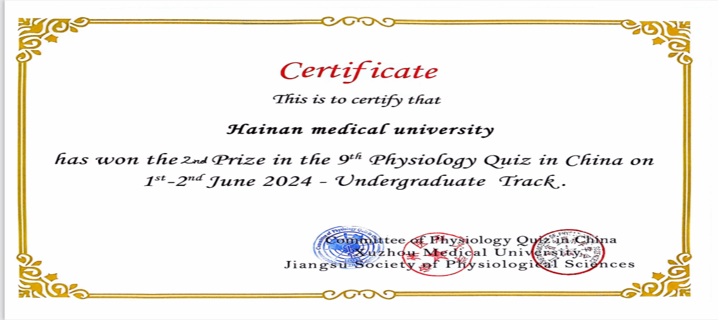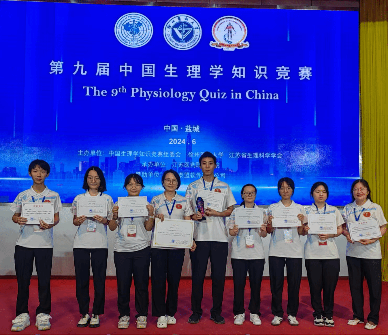 2024年5月31日-2024年6月3日,第九届中国生理学知识竞赛如期在江苏省盐城市江苏医药职业学院举行,全国19所本科院校,共33支代表队参加比赛。本次比赛由中国生理学知识竞赛组委会、徐州医科大学、江苏省生理科学学会主办,江苏医药职业学院承办。比赛由大赛组委会主席、徐州医科大学孙红教授主持。在此次比赛中,我校参赛选手表现优秀,荣获此次大赛的第四名。