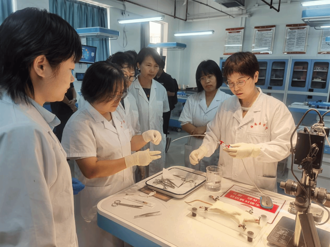 分享期间,参会教师们与嘉宾进行了热烈的讨论和交流。会后,曾思恩教授和病理科的同仁进行深入的学科交流,集体备课;龚永生、范小芳教授在功能学实验室,对接下来即将开展的线上线下+实体模拟+基础临床结合“失血性休克”实验教学新模式进行指导,并传授大鼠失血性休克模型制备和微循环观察技术。大家纷纷表示,通过此次活动,对基础医学学科建设有了更深入的认识和理解,也收获了许多宝贵的经验和做法。未来,学院将继续加强与其他医学院校的交流与合作,共同推动基础医学学科建设的不断发展与创新。