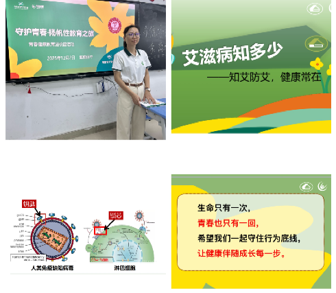 宣讲中,王英老师首先为同学们清晰地梳理了艾滋病的基本定义、病毒特性及其对人体免疫系统的危害。她重点结合青少年学生的生活实际,详细讲解了艾滋病的三大传播途径(血液、性接触和母婴传播)以及日常生活中不会造成传染的无风险行为,强调了科学认知是有效预防的第一步。