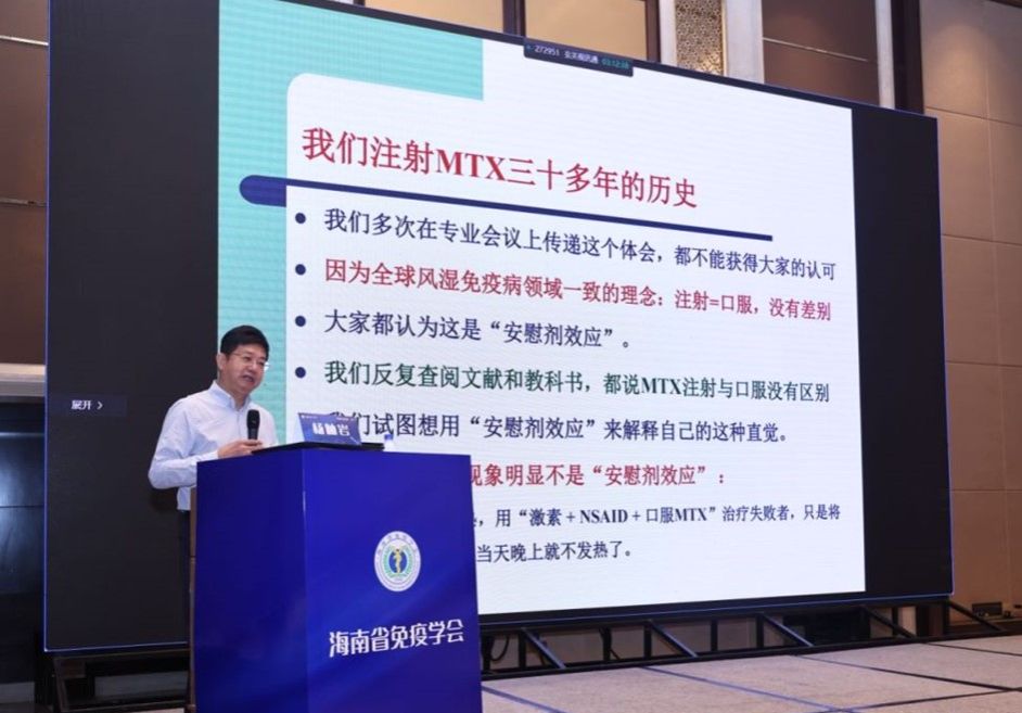 大会同期举办了甲氨蝶呤在自身免疫性疾病中应用新进展研讨会,参会专家就甲氨蝶呤在自身免疫性疾病中的应用新进展作专题报告,并深度讨论相关专业的热点问题。海南省人民医院风湿免疫科林书典主任做《甲氨蝶呤在风湿性疾病中的应用中国专家共识》解读、海南省人民医院皮肤科韩科主任做《甲氨蝶呤治疗银屑病应用专家共识》解读、中山大学附属第一医院杨岫岩教授做《经验谈:抗风湿神药甲氨蝶呤》专题讲座并分享风湿病诊疗经验。与会专家围绕“如何看待甲氨蝶呤皮下注射在RA患者/银屑病患者治疗中的疗效及安全性数据”、“中国现有的RA患者/银屑病患者在临床治疗中有哪些未满足的需求”两个话题展开热烈讨论,专题讲座精彩纷呈,与会者受益匪浅。