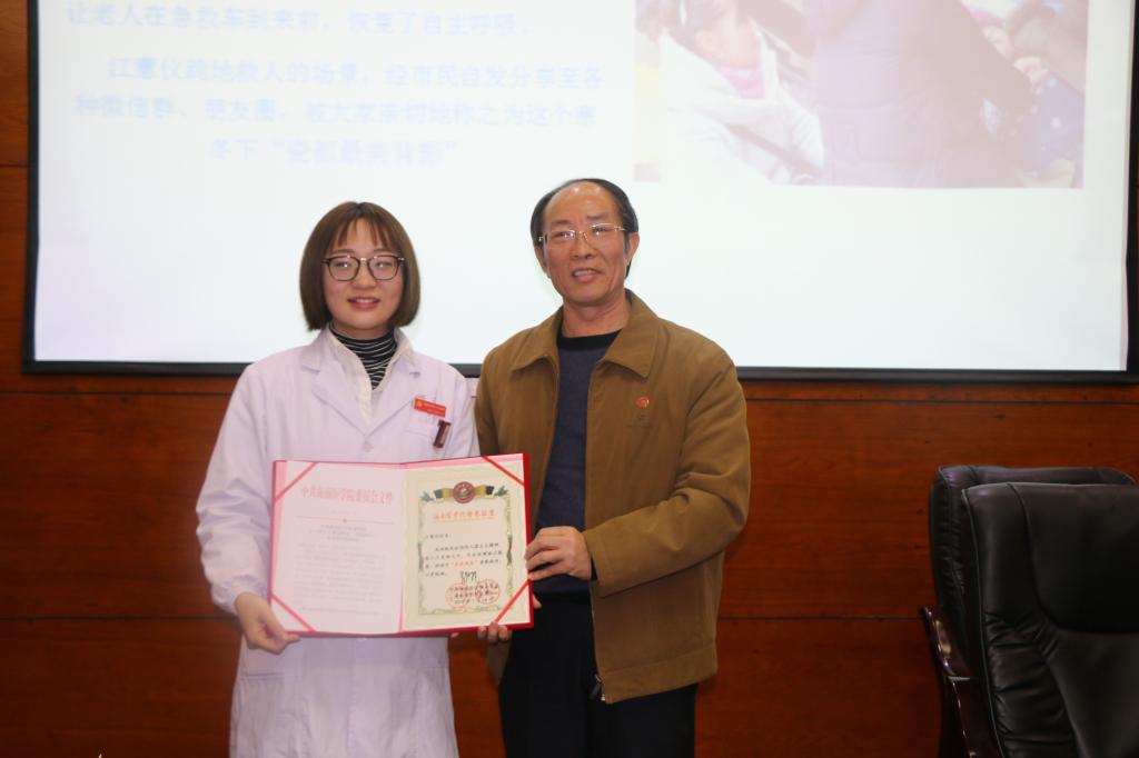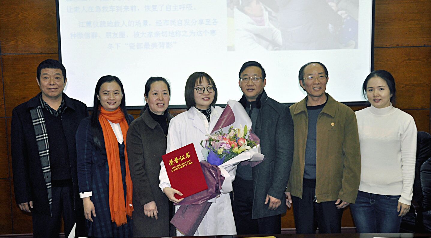 2018年1月10 日上午10 时许,半年前才进入江西省景德镇市第二人民医院放射科工作的我校2017届医学影像技术专业毕业生江蕙仪,在景德镇市某小区里,冒着严寒双膝跪地为突然晕倒的一名老妪实施院前急救,成功地在救护车抵达之前帮老人恢复了自主呼吸。她救人的视频很快在网上传开,人们纷纷称赞:江蕙仪的背影是这个寒冬下,景德镇的“最美背影”。