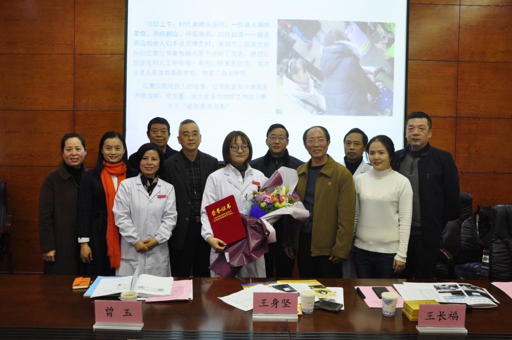 1月18日上午9时许,党委宣传部部长王身坚,保卫处副处长、校红十字会应急救护培训指导老师王长福,校红十字会应急救护培训指导老师、江蕙仪的辅导员曾玉,党委宣传部校报编辑部老师吴丹榕一行4人,来到景德镇市第二人民医院,受到了该院有关领导和相关部门负责人的热情接待。