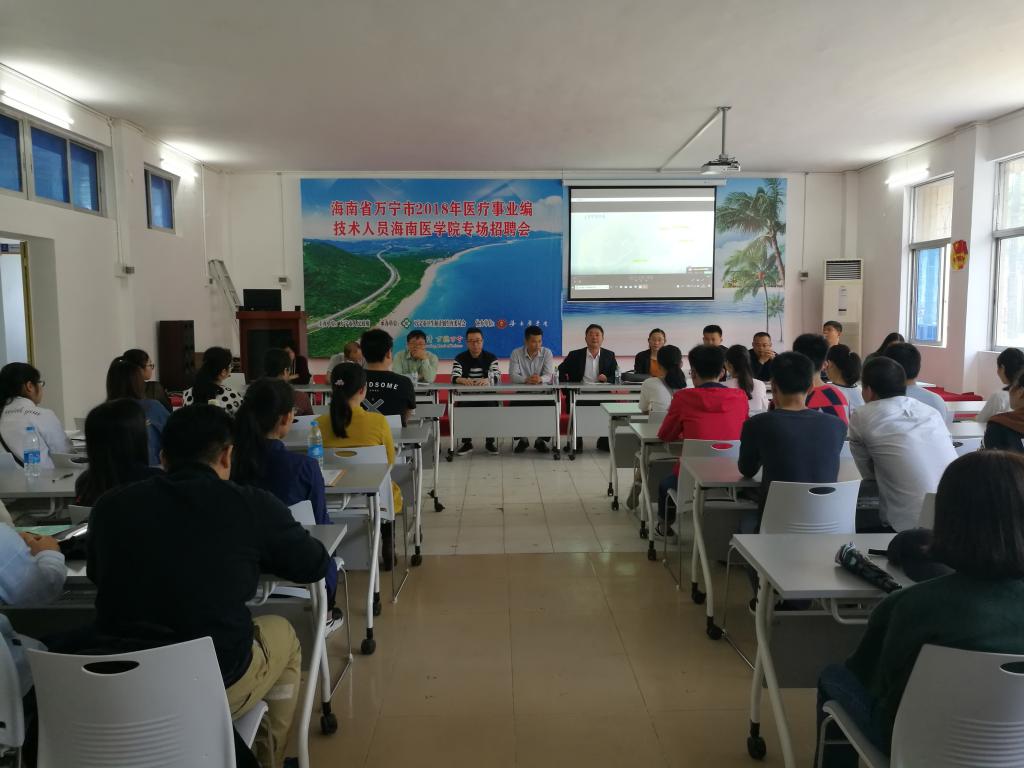 专场招聘会在我校大学生中心演播中心召开。我校招生与就业指导处处长郭宇代表学校欢迎万宁市招聘团一行。万宁市人民政府高度重视本次招聘活动,由万宁市卫生和计划生育委员会副主任卢传毅、万宁市人民医院院长陈吴荣等13人组成招聘团。本次的招聘会历时两天, 13日上午召开宣讲会并全天接受毕业生应聘报名,14日上午进行面试下午现场签约落实事业编制。招聘对象为我校应届毕业生,用人单位将从专业成绩、思想品德、爱岗敬业精神等条件出发,招聘适合的人才。