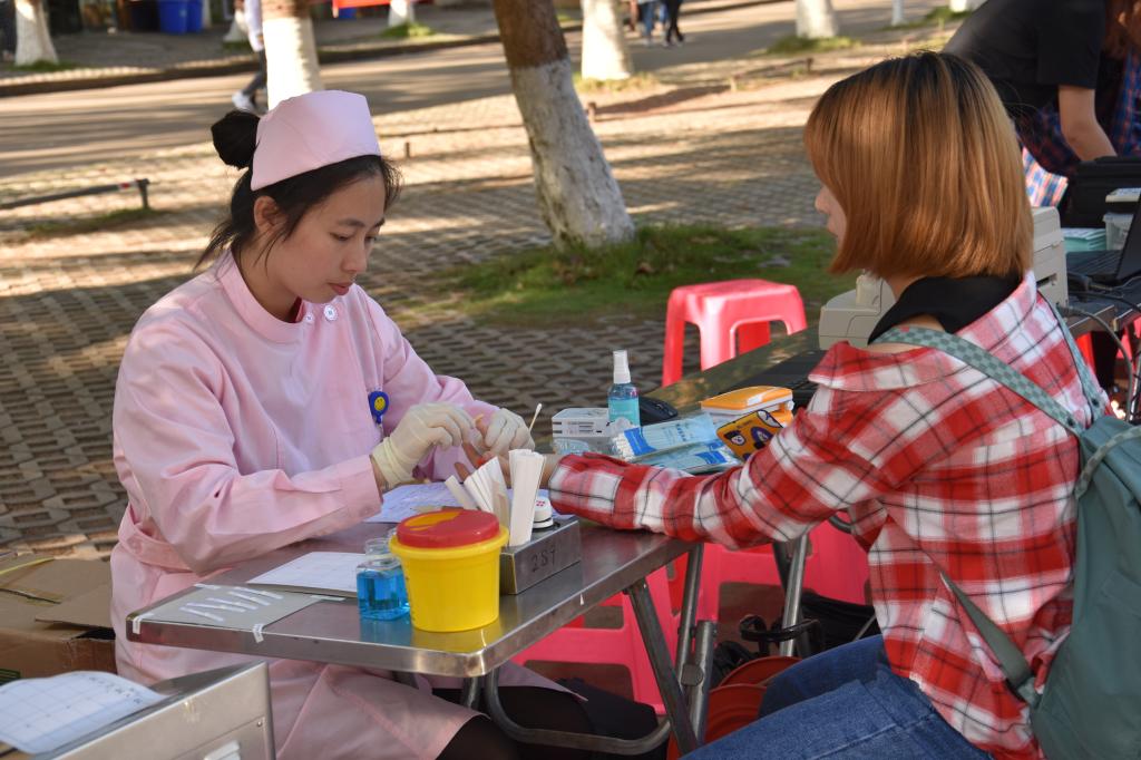 工作人员在为献血学生做血型检测