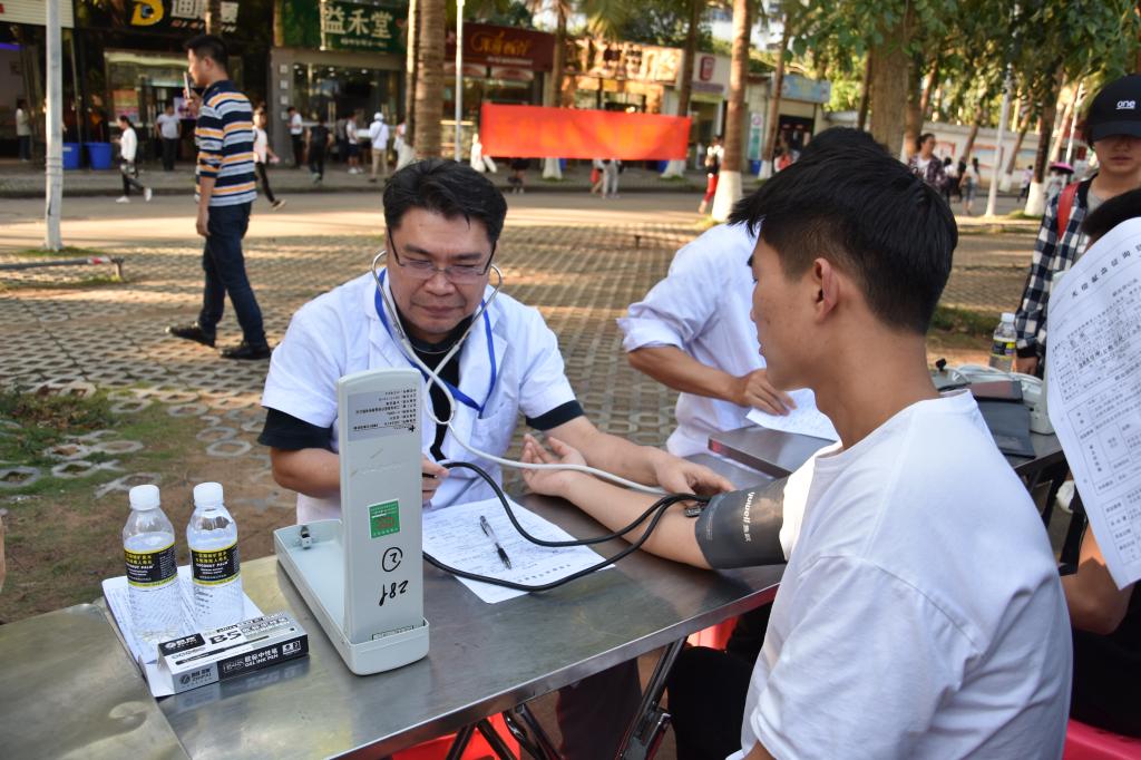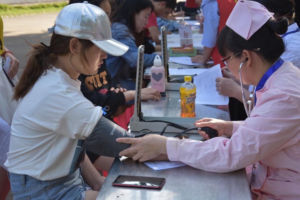 工作人员在为献血学生做身体检查