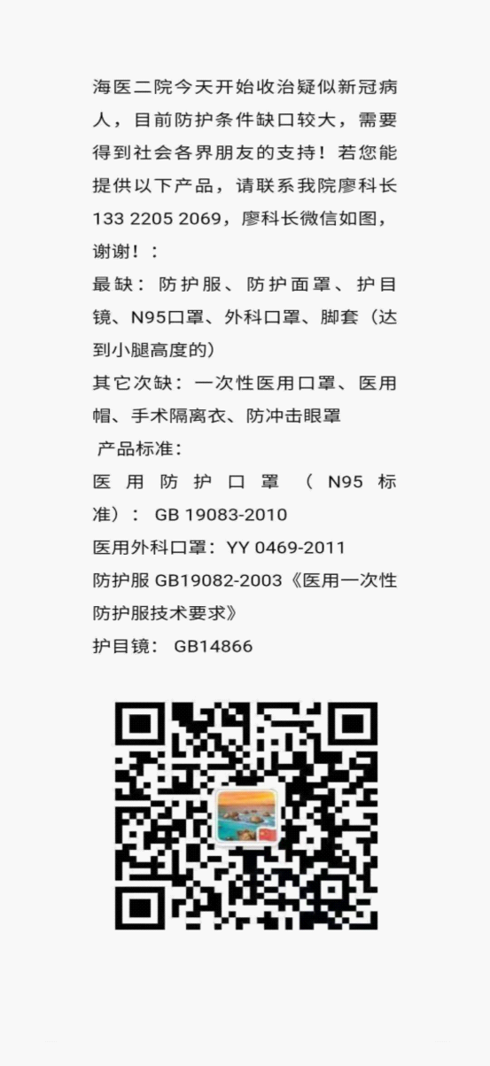 自新型冠状病毒感染的肺炎疫情发生以来, 各附属医院全院职工全力投入疫情防控工作中,日夜奋战在第一线。为保护前线医护人员,呼吁爱心企业弘扬奉献精神,为抗击疫情贡献一份力量, 公卫学院及各附属医院接受社会各界依法合规捐赠渠道、资质齐全的防护物资。相关物资需求如下: