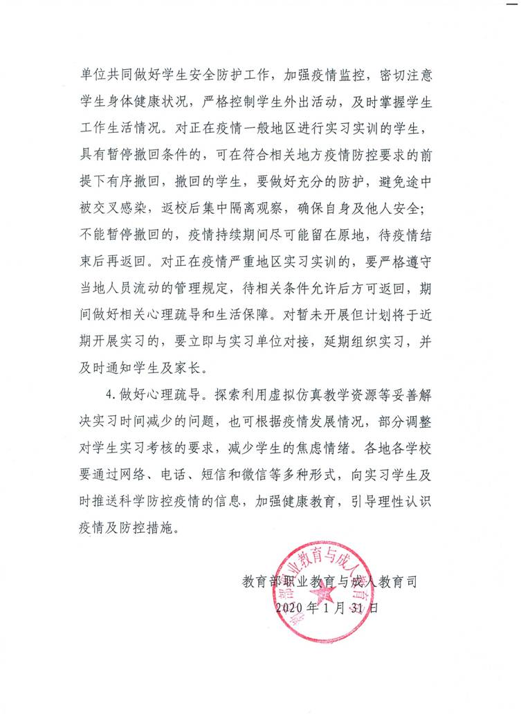 关于加强新型冠状病毒肺炎疫情防疫期间学生实习实训管理工作的通知