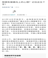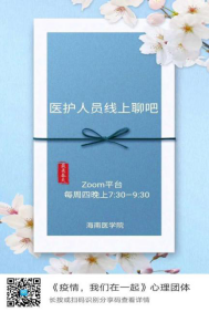 小组成员不仅参加本校的心理援助工作,还积极参与社会各界的心理援助工作。小组组长杨娟教授身先士卒,参加了清华大学抗击疫情心理援助热线、海南省高等学校2020年开学第一课中“心理健康板块”线上课程录制、海南省科协新冠肺炎心理科普支援服务队;第一临床学院党委副书记张万科书记参加了海口市隔离酒店留观人员的心理援助工作,为海南省和海口市的心理援助工作提供专业支持;第一附属医院心理科任泽普医生参加了清华大学抗击疫情心理援助热线;朱唤清副教授和宋娜老师参加了教育部华中师范大学心理援助热线,这是作为海医人的使命和担当,让我们油然起敬!