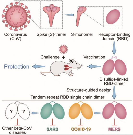 图1.MERS冠状病毒RBD二聚体结构以及串联重复RBD单链二聚体设计策略