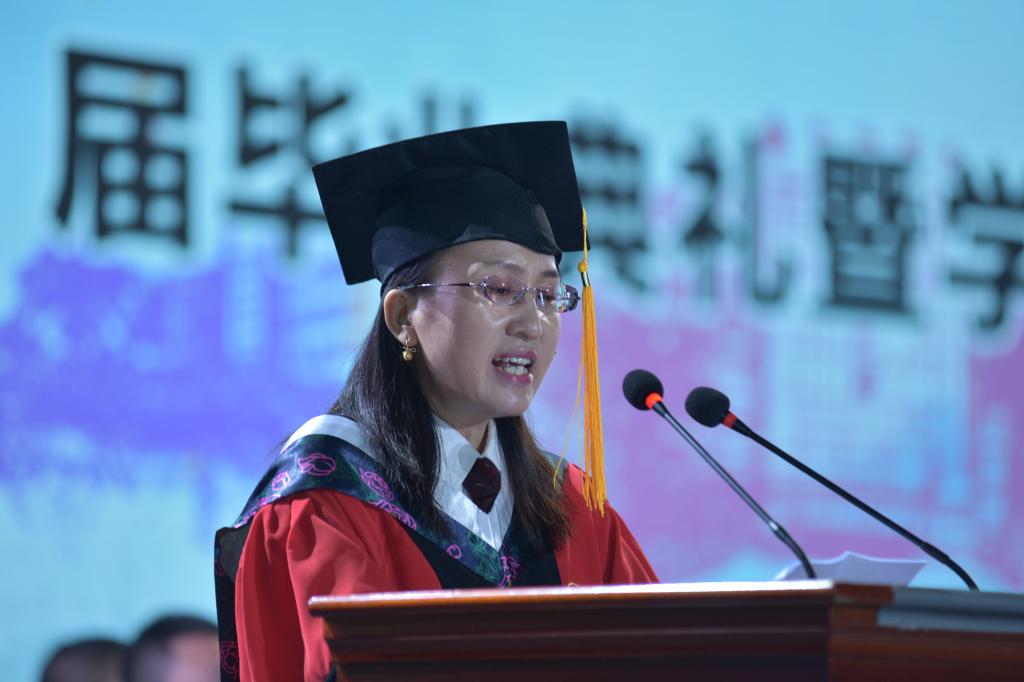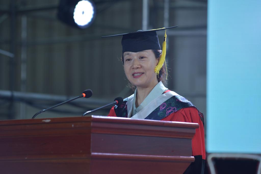 基础医学院与生命科学学院牛莉娜教授代表教师发言。她代表全体老师向同学们表示热烈祝贺,为同学们的努力及所取得的成就感到骄傲和自豪。她引用了“昨夜西风凋碧树,独上高楼,望尽天涯路”“衣带渐宽终不悔,为伊消得人憔悴”“众里寻他千百度,蓦然回首,那人却在灯火阑珊处”三句诗词,以此期望毕业生能达到人生的三层境界:一是“立志向”;二是“守志向”;三是“得成果”。最后她祝愿毕业生们步入社会后心系国家,心系人民,脚踏实地,勇敢前行,实现人生梦想。
