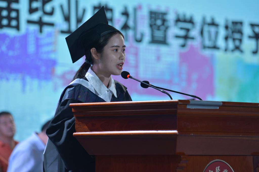 学生代表林万芸发言,她总结了大学五年来所学知识和专业发展,讲述了大学五年的经历和取得的学习成绩,也深切表达对学校领导、学院老师的感激之情和对同学、朋友的不舍和祝愿之情,以及对即将踏入社会的坚定信心。学生代表吴璐伶领誓,带领全毕业生共同宣誓,“……献身医学、救死扶伤、为人类身心健康奋斗终生!”的誓言在会场久久回荡。毕业典礼在全体师生共同唱起