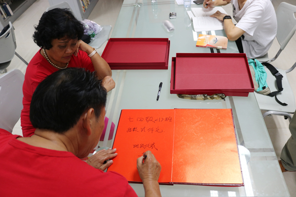 在我校统战部(校友办)部长(主任)冯武的陪同下,校友们首先参观我校校史馆。校友们在校史馆听取讲解员介绍了我校发展史和现状后,感慨万分,千恩万谢,并纷纷在校友留言册上提笔留言,抒发感恩母校情怀。班长代表77届一班全体同学为母校捐款两千元,77届二班校友余伯妹个人捐款两千元,并希望母校越办越好,同时表示以后会常回母校看看,会更加关心、支持母校的建设与发展。
