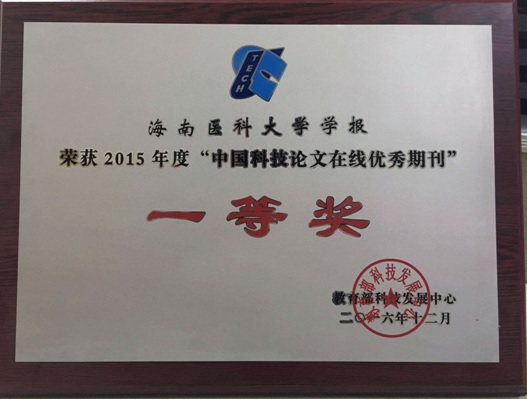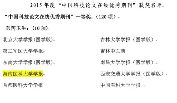 近日获悉,教育部科技发展中心公布了2015年“中国科技论文在线优秀期刊”暨“中国科技论文在线科技期刊优秀组织单位”评选结果(http://www.paper.edu.cn/info/info_detail/4910/),我校学报荣获“中国科技论文在线优秀期刊一等奖”。本次全国医药卫生类期刊共有10个获得一等奖,23个获得二等奖。