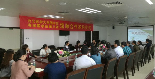 图书馆与台北医学大学图书馆馆际合作交流会议在图书馆七楼会议室举行。我校曾渝副校长、海南省高校图工委主任、海南大学图书馆王琦馆长、海南师范大学图书馆符史涵书记、李冕斌副馆长、海南省高校图工委副主任海南职业技术学院图书馆王海馆长以及我校图书馆全体教职工参加了本次会议。