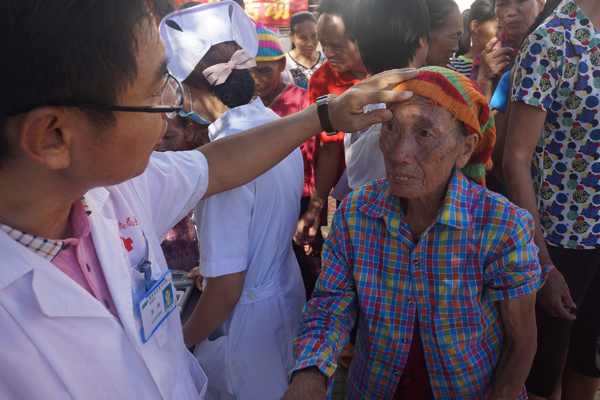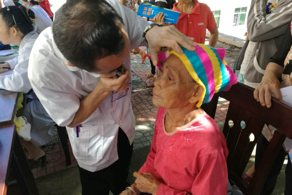 眼科吴子东主任在给黎族同胞检查