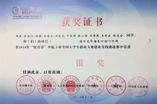 经过各高校竞赛、各省市自治区省赛、全国复赛选拔,共有来自全国220所高校的359支队伍进入最后终审决赛。我校“海口光华海医口腔门诊部”项目团队(团队成员:禹东、梁金玉、陈薇、朱博文、王家文、于东琛、陈小丽、王景彬、王彩云、林道金,指导老师:林典岳教授、张黎副教授)由校团委林仕芬、彭臻喆老师带队,代表海南省参加了2016年“创青春”中航工业全国大学生创业大赛终审决赛。经过激烈的竞争和角逐,我校团队在参赛的359支队伍中脱颖而出,最终夺得2016年“创青春”中航工业全国大学生创业大赛创业实践挑战赛银奖的银奖,取得了我校历史上的突破,为海南省以及