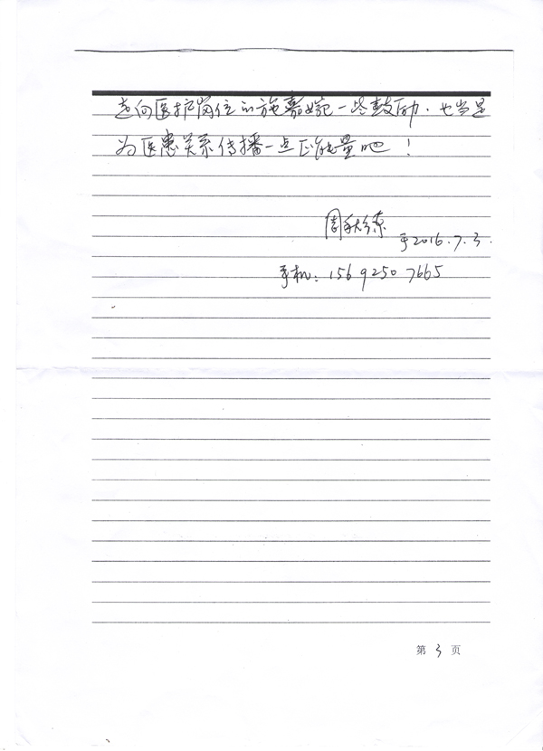 患者对施嘉婉同学和国际护理学院的领导和老师表达了深切的感激之情,并希望借此表扬信为医患关系传播正能量。表扬信是患者对医护工作者的最大肯定。“健康所系、性命相托”,这是医护工作者的价值与核心所在。只有将患者生命与健康视为己任,让病人感受亲情般的温暖,用无私的关爱、奉献、真诚与服务呵护患者,为患者解除疾苦,才能赢得患者的信任。而作为医护工作者的塑造者、引路人,医学教育工作者更应该加强自身人文素养,言传身教,培养出敬畏生命、敬畏病人、敬畏科学的,始终站在患者身边的暖心医护。(王媛媛/文)