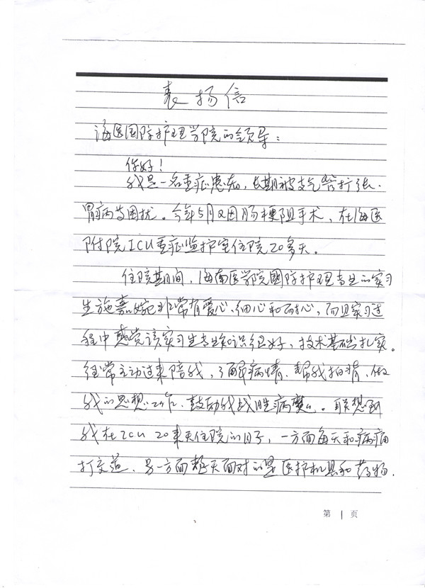 ——我校国际护理学院收到一封来自重症患者的表扬信