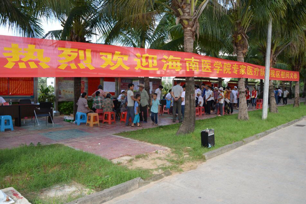 专家医疗队到我区慰问义诊”、“专家义诊为群众,送医下乡献爱心”等内容的横幅、标语。由于当地政府提前一周就将本次义诊活动的喜讯张贴在区上各醒目位置,因此闻讯而来等候看病的村民早早就“扎堆”在椰子树下人行道上临时设置的义诊现场,有拄着拐杖的百岁老人,有怀抱孩子的妇女,有被人搀扶行动不便的患者,更多的是携老扶幼地赶来的村民。“这么多专家到村里来,机会难得!所以我早早就赶来排队了。”听说医学院的专家要来干沟村义诊,住在十里开外的徐阿婆6点多钟就从近邻的荔枝沟村出门,赶来义诊现场。
