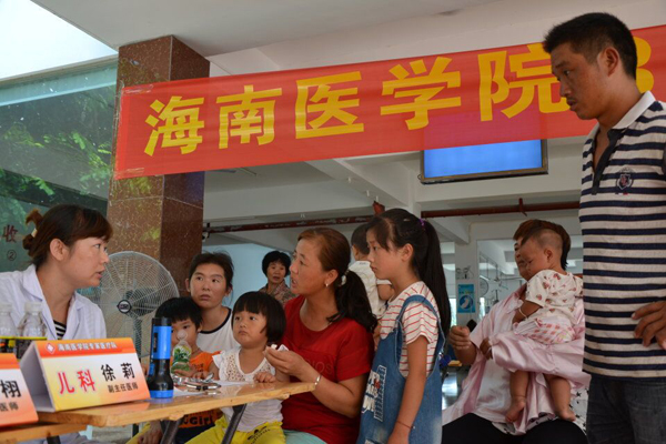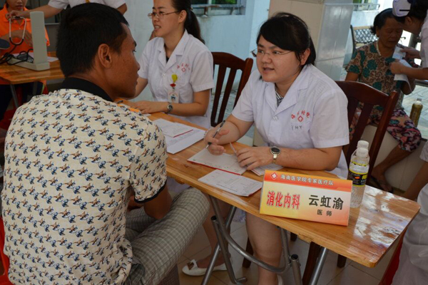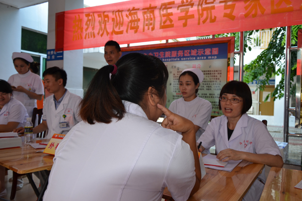 由于就诊的人太多,加上医疗队中有些医生不懂海南话和当地语言,在义诊现场,卫生院的几位医务人员和大学生志愿者便主动当起了“翻译”。如此一来,医疗队的义诊效率大大提高。