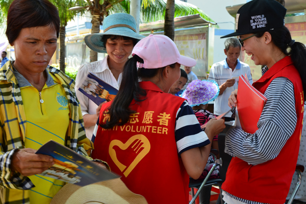 亲临现场看望慰问医疗服务团队的林英姿副院长、三亚吉阳区委副书记、常委冯武等领导主动当起了义务员,给群众们发放健康教育宣传资料。