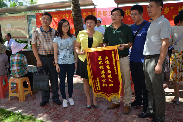 除了群众的热情外,此次活动还得到了陵水、三亚当地政府的大力支持,陵水县卫计局局长黄国经,我校在当地挂职任三亚市吉阳区党委副书记、常委的冯武,以及卫计局、区妇联、区团委、干沟村等部门领导都到义诊现场看望慰问专家,对义诊活动赞赏有加。冯武常委代表吉阳区委区政府向学校赠送了锦旗:“医德高尚暖人心,医术精湛传吉阳”。